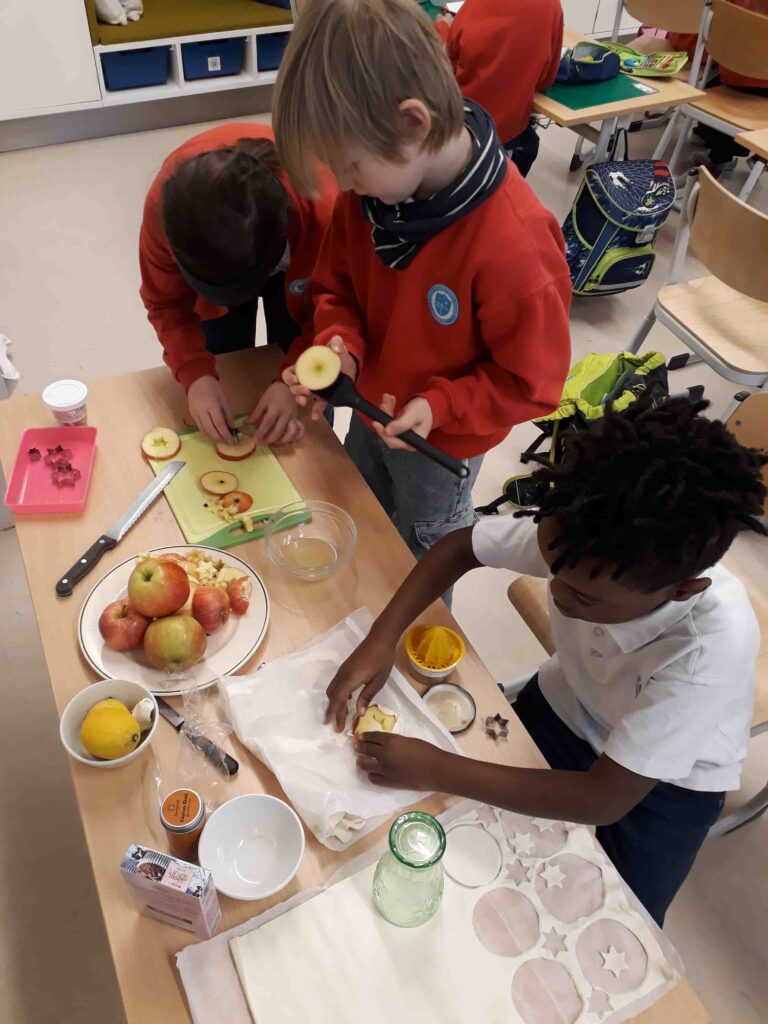 As part of the GG generosity program, we dealt with the fairy tale “Sterntaler” and lived the idea of sharing by the children baking their own “Sterntaler” and distributing them in the head office and to the teachers. Another highlight was our joint ice skating trip.