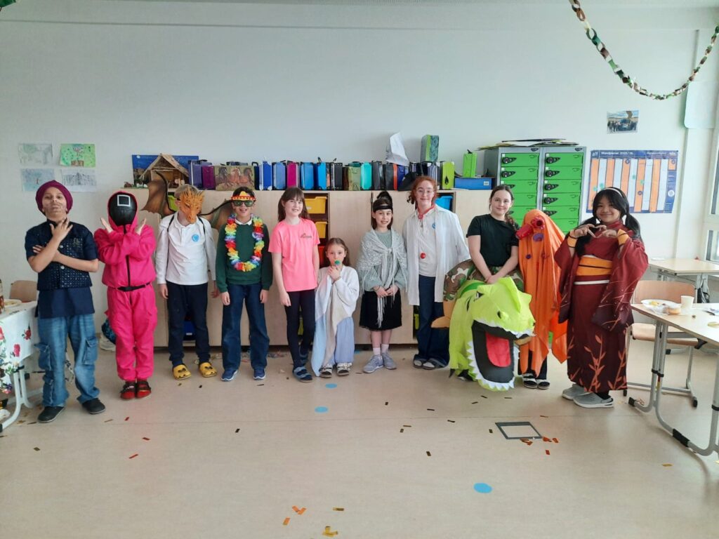 The children planned their carnival party all by themselves. They created a buffet and a drinks list – and everyone contributed something. Balloons and garlands were hung up with great joy and a colorful carnival picture was created for the blackboard. The students also prepared the program with games and music themselves.