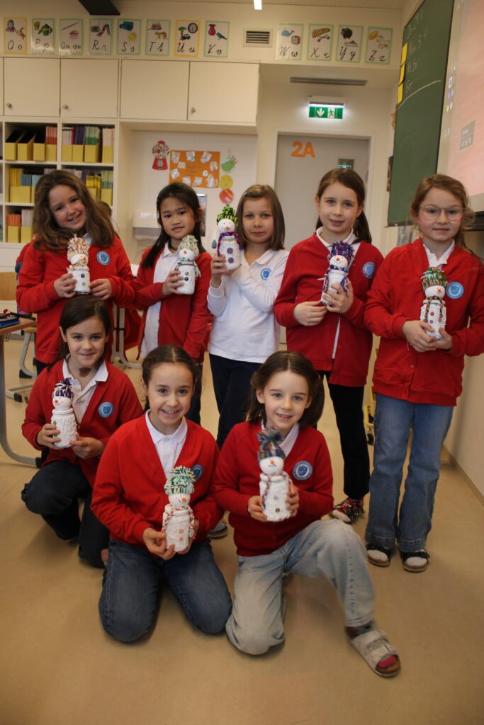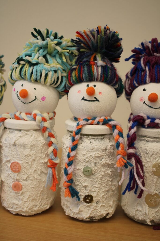 The children made snowmen out of old jam jars as the final winter work in their textile craft lessons.