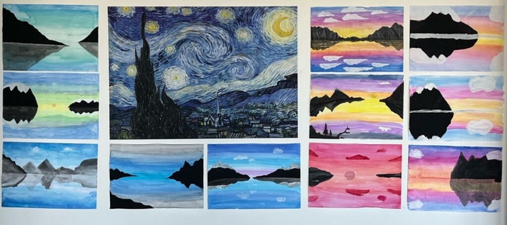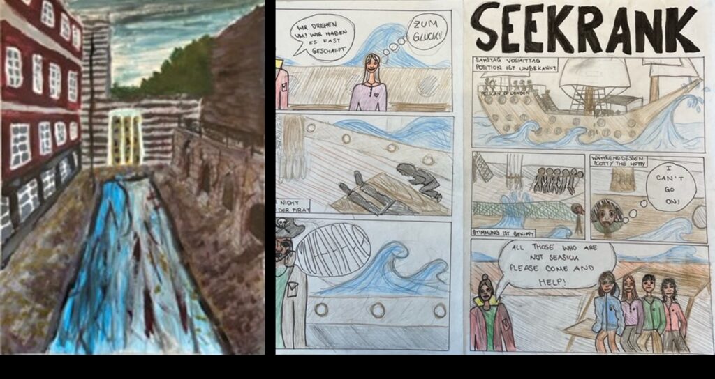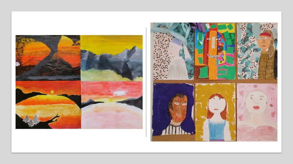 We can look back on a very productive half-year in the subject “Art and Design” at Stella-Gymnasium. We have invited artists to the 2. and 3rd grades, portrait drawings combined with color field painting (1st and 2nd grades) and a focus on impressionism in the fall. The winter landscapes in Year 4 and the comics about the trip to Ireland in Year 5A were particularly successful.