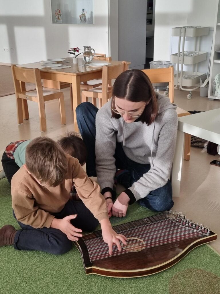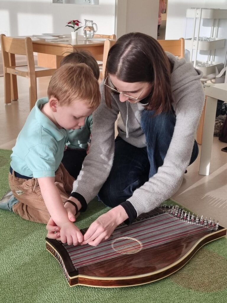 A colleague is currently completing her final practical training in the moon group as part of her training as an elementary teacher. Her chosen project topic: music and musical instruments. As part of this, the children were given a particularly sonorous experience: a musician with a zither and a musician with a viola visited the kindergarten.