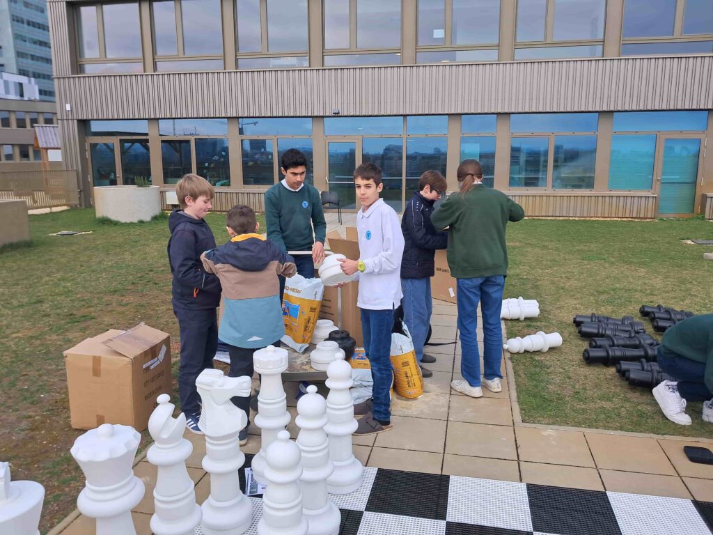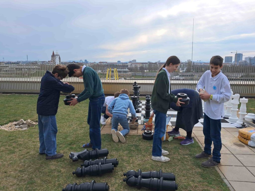 Am 16. März wurde unser neues Riesenschach aufgebaut – trotz plötzlichem Temperatursturz in der Donaucity. Die Figuren mussten erst zusammengesetzt und anschließend mit etwa 2 kg Sand gefüllt werden, damit sie nicht davonfliegen. Natürlich ganz genau abgewogen mit Geräten aus dem Physiksaal – Wissenschaft muss sein.